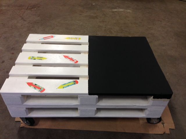 Knutseltafel voor kinderen, ons basis product bestaat uit 2 wit geverfde pallets met op de bovenste helft krijtverf en een plastic plaat. Onder het gedeelte waar je op kan krijten zitten vakjes waar je je spullen kan bewaren. Deze vakjes zijn in dit geval rood en geel, dit kunnen ook naar wens andere kleuren worden. Leuk voor de kinderen om onder de plastic plaat figuren met deco patch papier te beplakken.